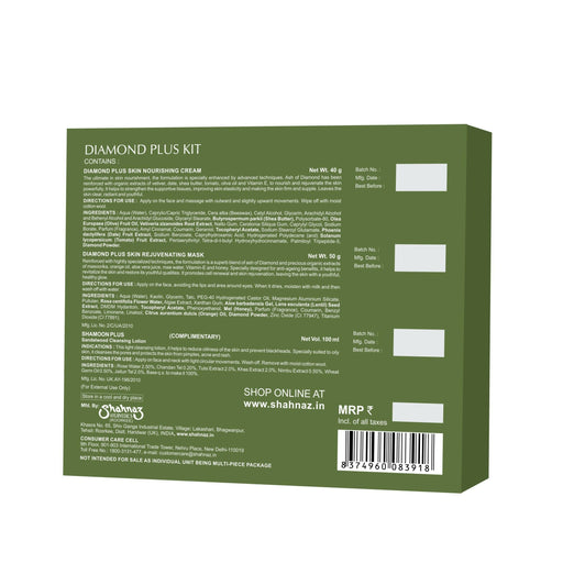 Shahnaz Husain Diamond Plus Kit-BThis kit contains:Cream 40gm + Mask 50 Gm + Shamoon 100 Ml.