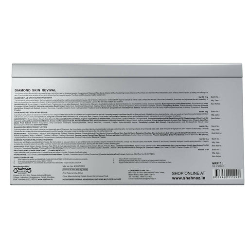Shahnaz Husain Diamond Plus Facial KitThis kit contains: Skin nourishing cream 10 gm Skin rejuvenating mask 10 gm Exfoliating scrub 10 gm Rehydrant...