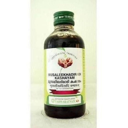 Vaidyaratnam Musaleekhadiradi Kashayam, For Gynecological Issues, 100% Herbal: 200 ml Vaidyaratnam Musaleekhadiradi Kashayam is an herbal product. ...