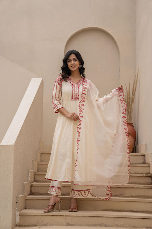 Juniper Off-White Anarkali Kurta Set With Red Embroidery And Organza DupattaProduct Details:Off white & red solid cotton kurta set with thread ...