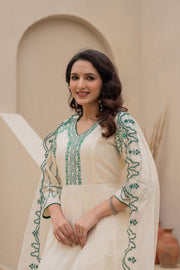 Juniper Off-White Anarkali Kurta Set With Green Embroidery And Organza Dupatta