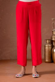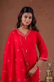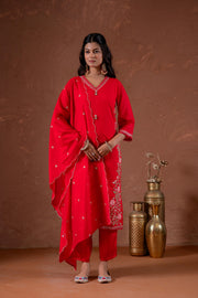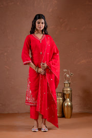 A Red Straight Embroidered Kurta With Pant And A Soft Dupatta. The Kurta Features Delicate Floral Embroidery In Pink And Green, Enhancing Its Elegance. Styled With A Simple V-Neckline And Three-Quarter Sleeves, This Look Is Completed With A Lightweight Dupatta And Minimal Embellishments, Perfect For Festive Gatherings And Traditional Occasions.