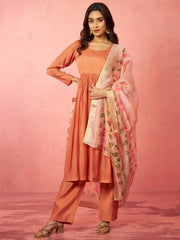 Create magical moments with Vastramay's peach silk blend anarkali kurta set. Features dazzling sequin embroidery on premium silk fabric, paired with comfortable silk straight pant and beautiful multicolour organza dupatta.