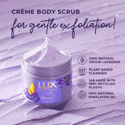 • The LUX Essence of the Himalayas Range is crafted with delicate care to ensure that Himalayan goodness is preserved to give you the most indulgent bathing experience.  Exfoliating your skin regularly is essential for glowing skin. New LUX Essence of Himalayas Creme Body Scrub with a combination of Lavender, Natural scrubbing beads, and Vitamin C. This creamy scrub polishes away skin impurities and dead skin while revealing the skin’s natural glow. Infused With vitamin C, which is known to enhance your natural glow.   The Calming Lavender Fragrance - an aromatic blend with notes of Bergamot, Rosemary, and Geranium transports you to a tranquil place of peace and calm. This creme scrub provides mild exfoliation, is paraben-free and is made with plant-based cleanser. It Contains lavender which is of 100% natural origin and this scrub is also infused with 100% natural Himalayan oil. Build your beauty regime with the Illuminating Bodywash or Exfoliating Soap from the LUX Essence of the Himalayas Range.
