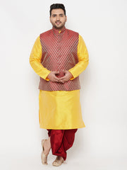 Plus Men's Maroon Nehru Jacket With Yellow Kurta And Maroon Dhoti Set
