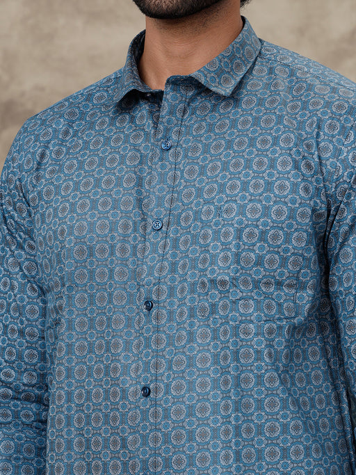 Men Dark Blue With Grey Matching Border Dhoti with Printed Shirt Set Fusion PS4