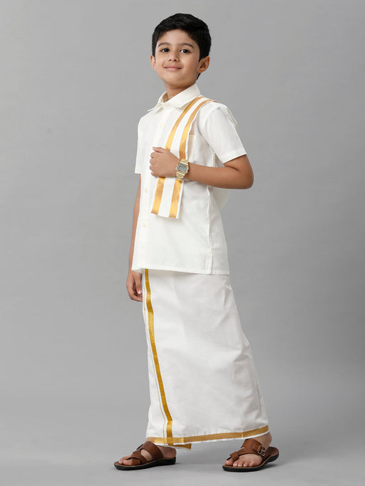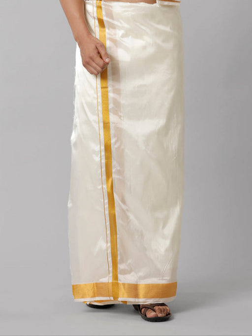 View full detailsMen Art Silk Double Layer Cream Dhoti with 3/4 Gold Jari Border Yoga