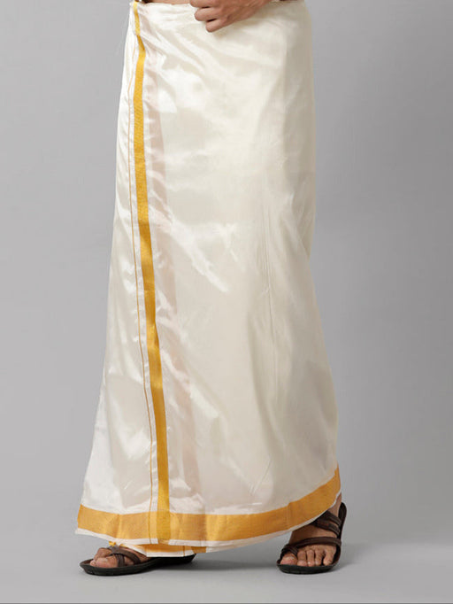 Men Art Silk Double Layer Cream Dhoti with 3/4 Gold Jari Border Yoga Product Details Material : Art Silk Dhoti Size : 1.24m X 3.60...