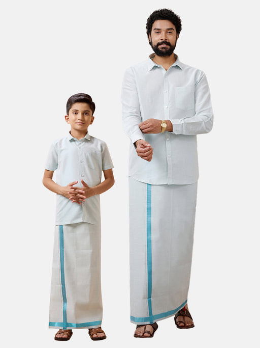 Like Father Like Son Tissue Jari Shirt Dhoti Combo Sankalpam Silver "The Exclusive Combo Only for the Online Store" Product Specification: Father :...