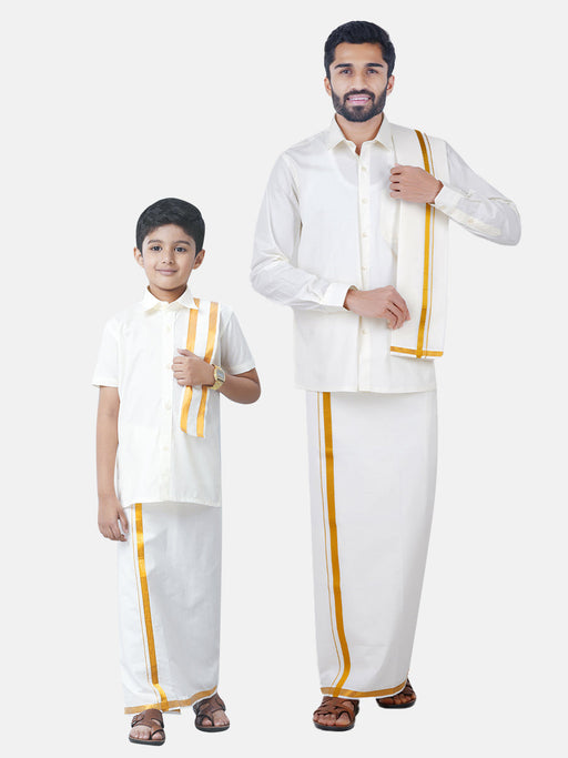 Like Father Like Son Tissue Jari Shirt Dhoti Combo Sankalpam Gold "The Exclusive Combo Only for the Online Store" Product Specification: Father : ...