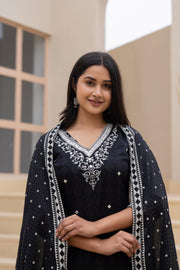 Classic black printed kurta set featuring intricate white embroidery and coordinated accessories. The kurta is designed with an elegant V-neckline adorned with fine thread embroidery, while the body and sleeves feature subtle geometric motifs. It comes with matching monochrome printed palazzo pants and a beautifully printed dupatta detailed with ethnic patterns and borders. Perfect for festive days, family functions, or ethnic office wear, this cotton-based set blends comfort with poise effortlessly.Legal Disclaimer :Product color may slightly vary due to photographic lighting sources or your monitor settings.