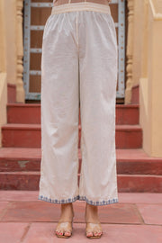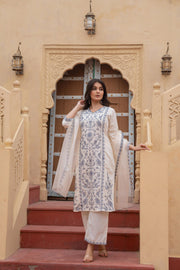 This off-white ethnic set adorned with delicate indigo blue floral embroidery. The kurta features a straight-cut silhouette with refined V-neckline detailing and intricate floral threadwork. Paired with comfortable straight-fit pants and a lightweight chiffon dupatta that carries matching embroidery on the borders, this set is ideal for elegant day outings and intimate gatherings.