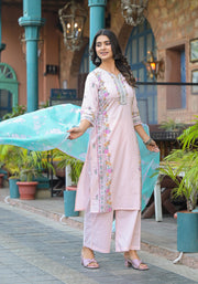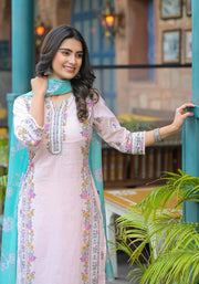 Radiate grace in this refreshing onion pink kurta set, designed with soft cotton for everyday comfort and charm. The straight kurta features delicate white embroidery and pastel floral side panels that add feminine flair. Paired with matching pants and a contrasting aqua blue dupatta adorned with floral motifs, this ensemble is perfect for casual gatherings, daytime functions, or festive events. The pastel palette and breathable fabric make it a summer must-have.Legal Disclaimer :Product color may slightly vary due to photographic lighting sources or your monitor settings.