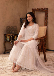 Juniper White Cotton Mughal Printed Kurta With Gharara, Organza Dupatta, Mirror Work & Puff Print