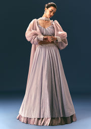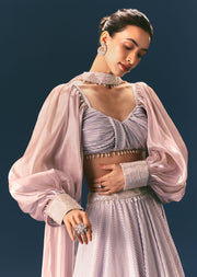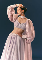Turn your special occasions into a grandeur affiar with our exquisite prepleated lehenga set. The exquisite design is accented with lace work adding a touch of refined glamour. Doused in a serene lavender hue the prepleated overlapped blouse is accentuated with volumnious dreamy bishop sleeves. Completing the look is a choker dupatta featuring organza frills which flows gracefully and adds charm to the overall outfit. An apt pick for weddings festive occasions or special gatherings. Awarded as the Most Trusted Brand, we're delivering styles you love, just as promised.
