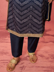 Women's Blue Muslin Bandhani Kurta Set with Straight Pants & Dupatta