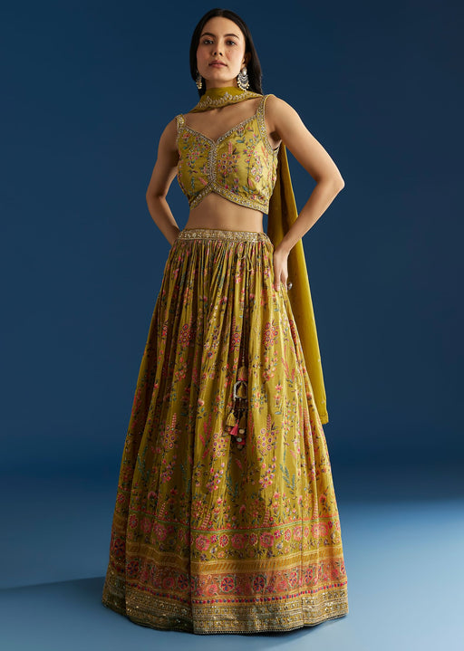 Mehendi Green Tissue Silk Lehenga With Zardosi Sequin Choli And Printed Dupatta