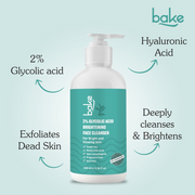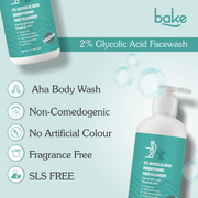 - Bake 2% Glycolic Acid Face Wash is carefully formulated to rejuvenate and enhance your skin's radiance. The face wash is formulated to help address dark spots, pigmentation issues, tan removal, and dull skin concerns. Harnessing the exfoliating prowess of 2% glycolic acid, this face wash gently sloughs away dead skin cells, unveiling a smoother, more even complexion beneath. Ideal for daily use, it not only brightens and revitalizes but also promotes a glowing, luminous appearance. The carefully balanced formula ensures that while it exfoliates and brightens, it does not strip the skin of its natural moisture.