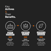• Boosted with Glycolic acid which belongs to the family of AHAs known for removing dead cells & promoting cell turnover through top layer exfoliation