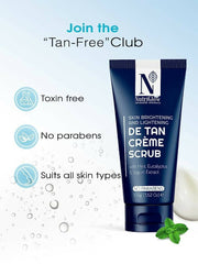 - Apply: Cleanse Your Face & Neck Area Gently And Part Dry. Apply The De-Tan Scrub On Your Face And Neck, Be Careful Around The Eye Area. Gently Massage With Steady Circular Motions To Exfoliate
