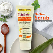 - Nutriglow De Tan Scrub With Milk Proteins & Mulethi, Instant Tan Removal & Skin Lightening, Removes Excessive Sun Tan, Blackheads, Reduces , Removes Dead Skin Cells, Keeps Skin Soft And Moist.
