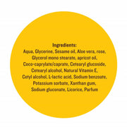 Aqua, Glycerine, Sesamum indicum (sesame) seed oil, Aloe barbadensis (aloe vera) juice, Rosa damascena (rose) infusion, Glycerol mono stearate, Prunus armeniaca (apricot) kernel oil, Coco-caprylate/caprate, Cetearyl glucoside, Cetearyl alcohol, Tocopherol, Cetyl alcohol, L-lactic acid, Sodium benzoate, Potassium sorbate, Xanthan gum, Sodium gluconate, Glycyrrhiza glabra (yashtimadhu) extract, Parfum, Linalool, Geraniol, Limonene, Farnesol, Citronellol.