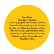 Aqua, Lauryl glucoside, Capryl/caprylyl glucoside, Curcuma longa (turmeric) extract, Glycerine, Matricaria recutita (chamomile) infusion, Symplocos racemosa (lodhara) infusion, Sodium cocoyl glutamate, Disodium cocoyl glutamate, Sodium gluconate, Azadirachta indica (neem) infusion, Citrus heticulata (mandarin oil), Sodium lactate, Zn PCA, Xanthan gum, Sodium levulinate, Citric acid, Potassium sorbate, Sodium gluconate, Cyperus rotundus (nagarmotha) extract, Parfum, Linalool, Geraniol, Citronellol, Limonene, Benzyl alcohol, Benzyl benzoate, Benzyl salicylate, Citral, Farnesol, Eugenol, Isoeugenol.