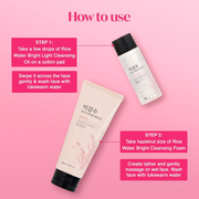 • Rice Water Bright Foaming Cleanser: Take a hazelnut amount of product and create a lather. Gently massage the lather in a circular motion on wet skin. Wash with lukewarm water.