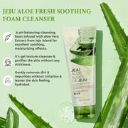 - 2 in 1 gel cleanser formulated with aloe from Jeju island, that soothes the face and body while providing a deep moisturizing effect. Dermatologically tested. It helps to restore skin's natural suppleness, and supports your tired, dull complexion by providing hydration boost giving skin a dewy glow. Give your skin the gift of gentle and wholesome cleansing with Jeju Aloe Fresh Soothing Foam Cleanser.