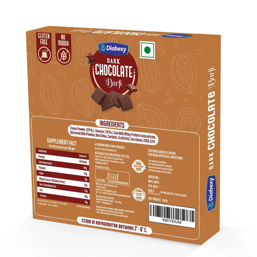 Diabexy Desi Ghee Chocolate BarfiIngredients:Hazelnut, Cocoa Powder, Whey Protein Concentrate, Desi Ghee, Skimmed Milk Powder, Erythritol, Sorbitol...