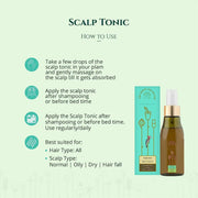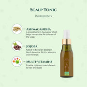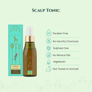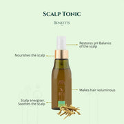 • This scalp tonic energizes the scalp and encourages better hair growth. Made using certified ingredients imported from renowned global sources, the scalp tonic is free of mineral oils and other harmful chemicals.