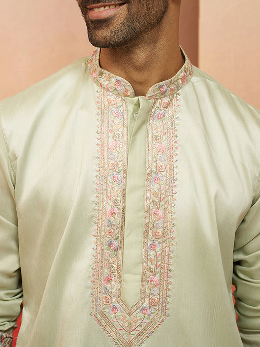View full detailsVastramay Men Pista Green Silk Embroidered Mid Kurta