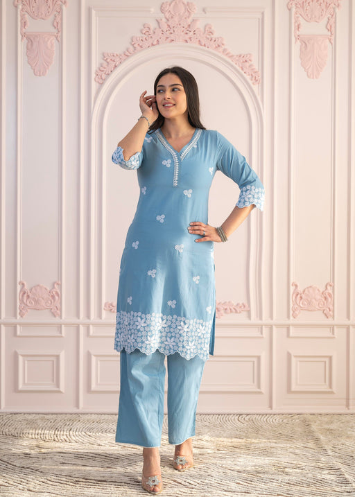 Juniper Powder Blue Embroidered Cotton Kurta With Palazzo & Lace WorkProduct Details:This Powder Blue Embroidered Cotton Kurta Features Delicat...
