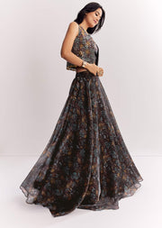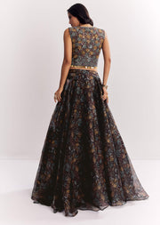 Black Printed Lehenga Choli With Mirror Work Jacket In Organza Tissue