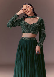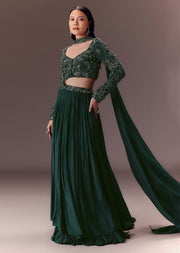 Green Ruched Frill Lehenga Set With Choker Dupatta