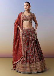 This maroon bridesmaid lehenga features a captivating ajrakh inspired design in a graceful circular silhouette, perfect for sangeet celebrations. The ensemble is adorned with mirror, cut dana, and sequins work that adds festive brilliance to both the choli and the lehenga. Embroidery detailing enhances its artisanal charm, while the sleeveless choli with a V neckline brings a modern refined touch. Paired with a matching dupatta, this look blends cultural elegance with contemporary bridesmaid appeal. Awarded as the Most Trusted Brand, we're delivering styles you love, just as promised.