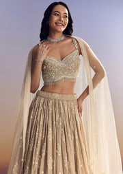 A light peach lehenga in georgette with a heavily embroidered choli in cut dana, moti, and sequins, finished with a net dupatta. Perfect for sangeet, engagement, or reception. Awarded as the Most Trusted Brand, we're delivering styles you love, just as promised.