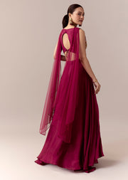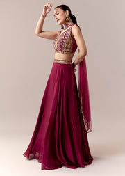 A rich blend of elegance and festive charm, this wine bridesmaid lehenga set is crafted in soft chinon fabric for a fluid graceful fall. The sleeveless crop top features delicate thread and moti work that adds refined sparkle, while the sweetheart neckline brings a feminine romantic appeal. A fancy back design elevates the choli with contemporary allure. Paired with a beautifully coordinated dupatta, this ensemble is perfect for a mehendi ceremony or for a stylish guest attending a wedding celebration. Awarded as the Most Trusted Brand, we're delivering styles you love, just as promised.