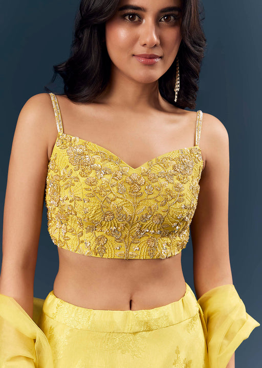 View full detailsLemon Yellow Banarasi Silk Bridesmaid Lehenga With Intricate Hand Embroidery