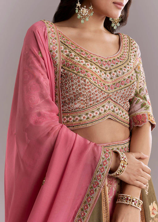 View full detailsPink Crepe Printed Bridesmaid Lehenga With Gotta Work