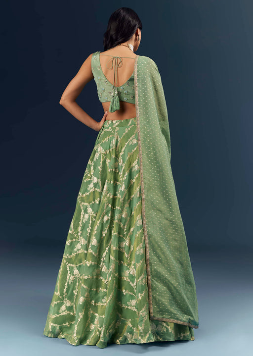 View full detailsSpa Green Banarasi Silk Bridesmaid Lehenga With Heavy Hand Embroidery