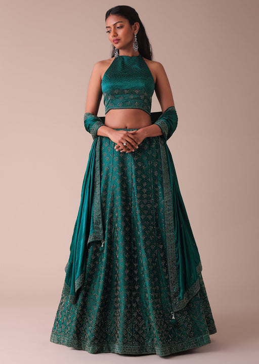 View full detailsDeep Green Swarovski Embellished Lehenga In Wrinkle Satin