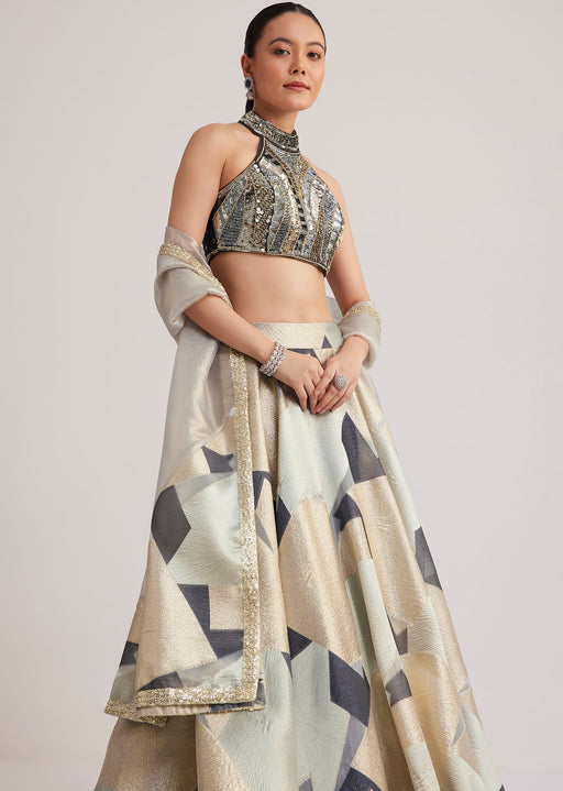 Exude Glamour With This Grey And Gold Choli And Lehenga Set Crafted From Luxe Net And Lurex Glitter Fabric. Adorned With Intricate Sequins Stones A...
