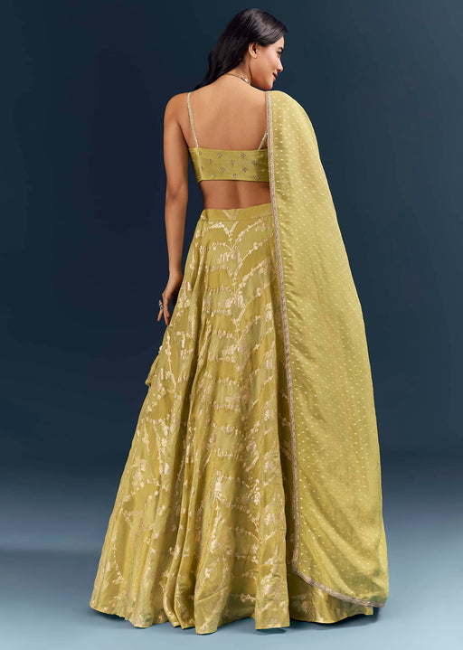 View full detailsMustard Yellow Embroidered Tissue Lehenga Choli Set