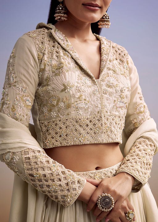 This beige organza lehenga set exudes understated luxury with its soft pastel tone and intricate tonal embroidery. The full-sleeve choli with a shi...