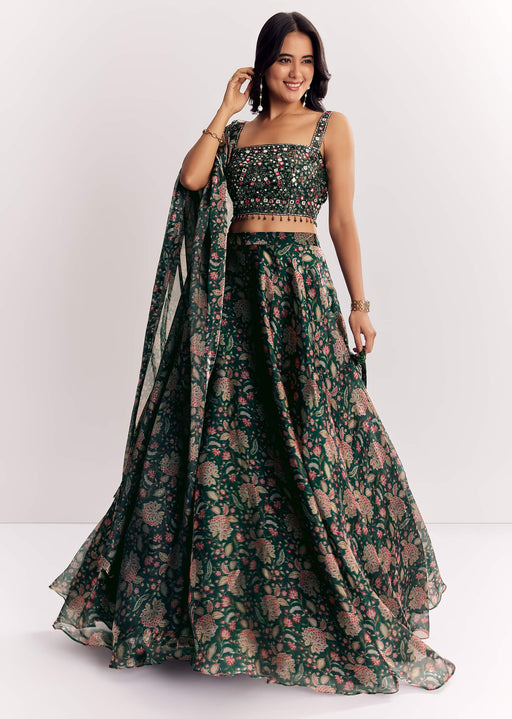 View full detailsBottle Green Mirror Work Lehenga Choli Set In Organza Tissue