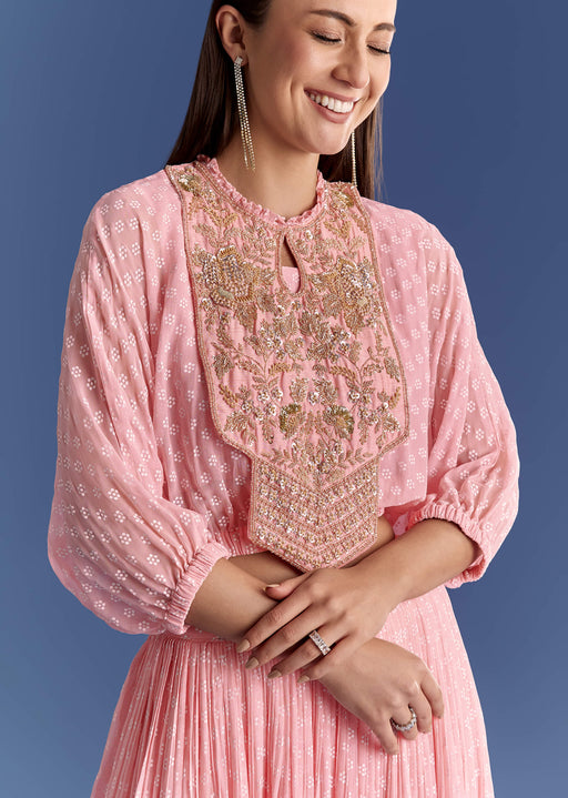 View full detailsPink Floral Georgette Lehenga Set With Zardosi Croptop