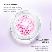 Niacinamide works deep within the skin to brighten from the inside out, refine texture, and visibly minimize pores, while Hyaluronic Serum delivers intense hydration, leaving your skin radiant and translucent.