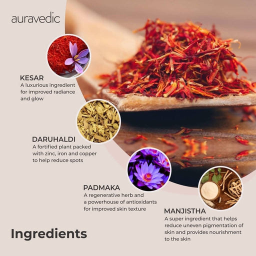Auravedic Kumkumadi Tailam Contains Saffron, a luxurious ingredient that enhances radiance and glow, Daruhaldi, a fortified plant loaded with zinc...