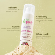 • La Pink Young Forever White Haldi Night Cream, a 100% Microplastic Free Formulation, helps maintain a healthy, youthful-looking skin.